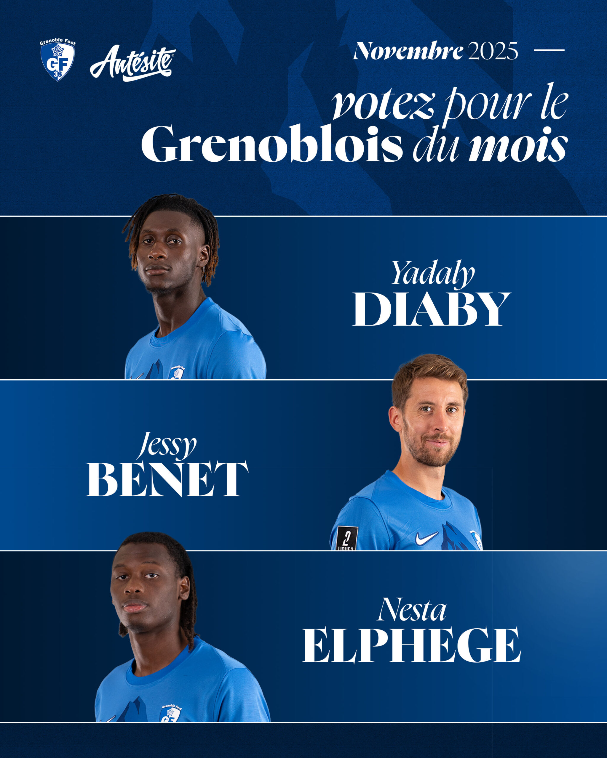 Comme chaque mois, les supporters du GF38 ont la possibilité d’élire le Grenoblois du mois, en partenariat avec Antésite. Trois joueurs se distinguent ce mois-ci par leurs performances, leur régularité ou leur impact dans le collectif.