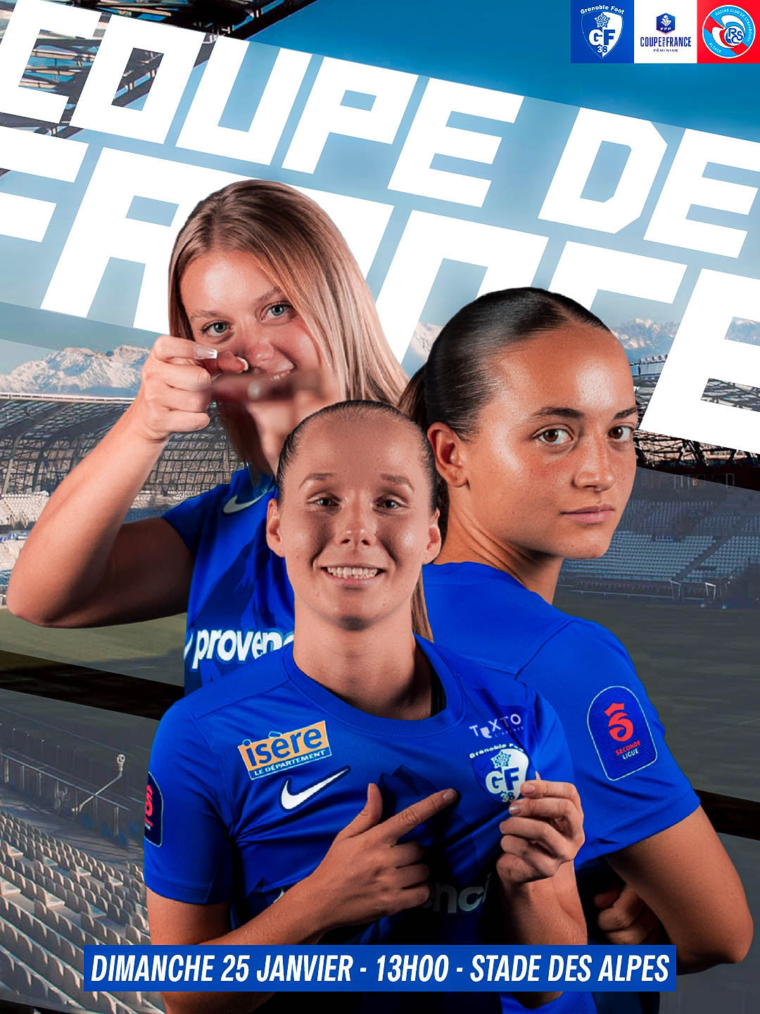 Le dimanche 25 janvier, le Stade des Alpes vibrera au rythme de la Coupe de France Féminine. À l’occasion des 8es de finale, nos Grenobloises affronteront le Racing Club de Strasbourg Alsace.